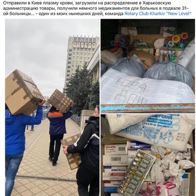 - Наш клуб Rotary Club Kharkiv ""New Level"" , Павел Филиппенко и ещё 7 членов клуба — приём в Харькове, сортировка, создание сети пунктов помощи, организаций, и груп активистов по всему городу и распределение по ним продуктов питания.