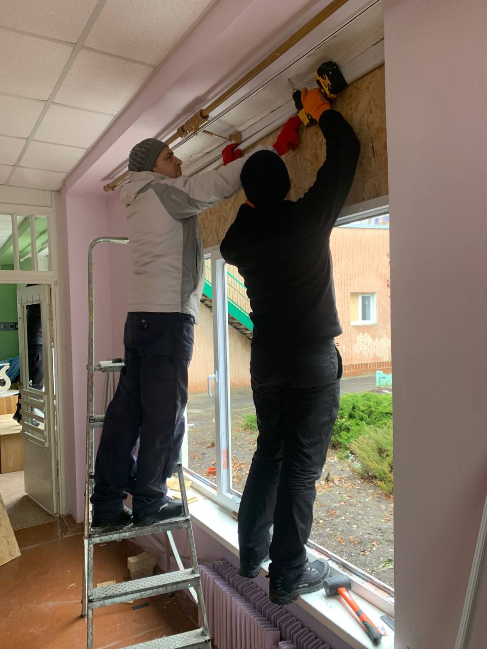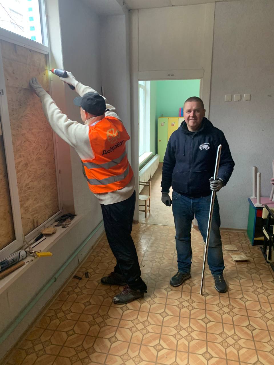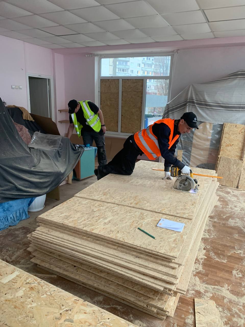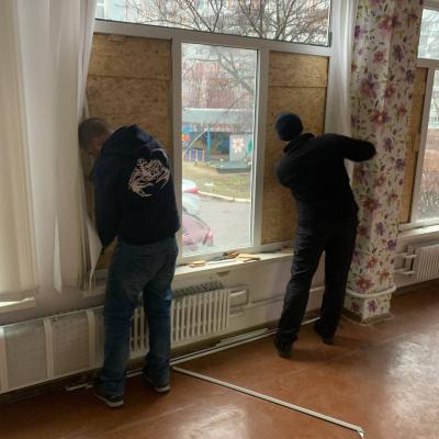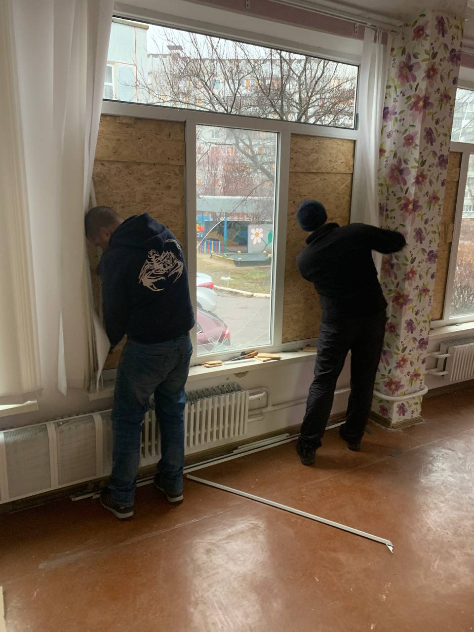 І Андрій Ворона - координатор волонтерів Харківського батальону Добробат не задумуючись розповість, що зашивка вікон листами ОСБ у Дошкільному навчальному закладі (ясла-садок) №363 ЙДЕ ЗА ПЛАНОМ!